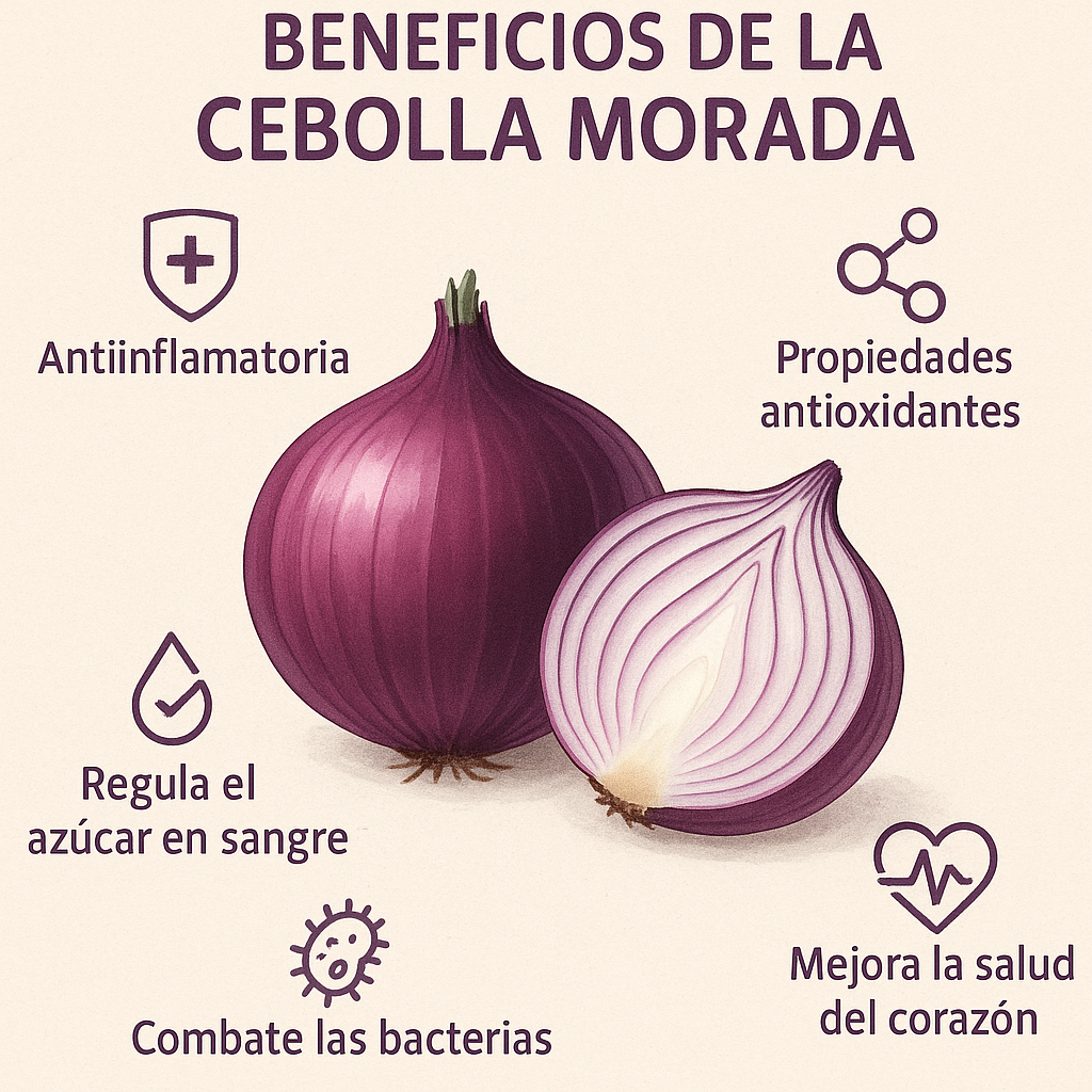 La cebolla morada se distingue por su color intenso y sabor ligeramente dulce. Sin embargo, lo más valioso está en sus compuestos naturales: